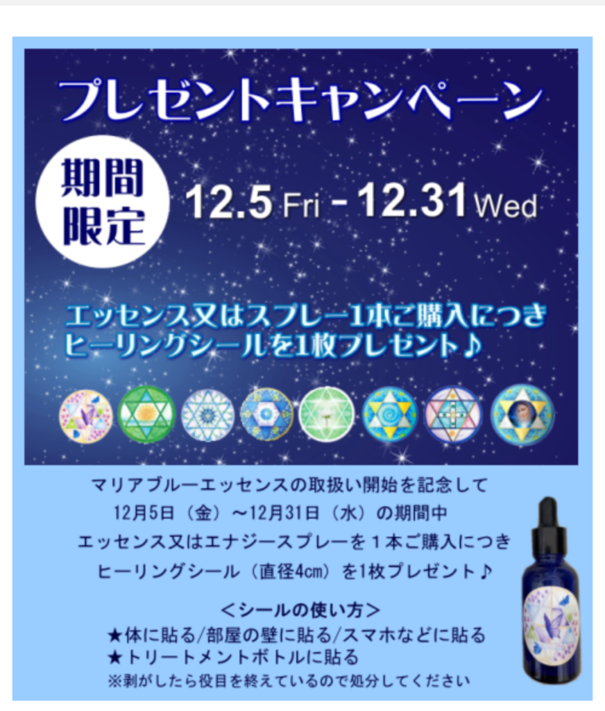🎁【12月5日(金)―12月31日(水)】の期間中、エッセンスまたはエナジースプレーを1本お買い上げにつき、各エッセンスに対応したヒーリングシールプレゼントぜひ一度ご覧下さい😊